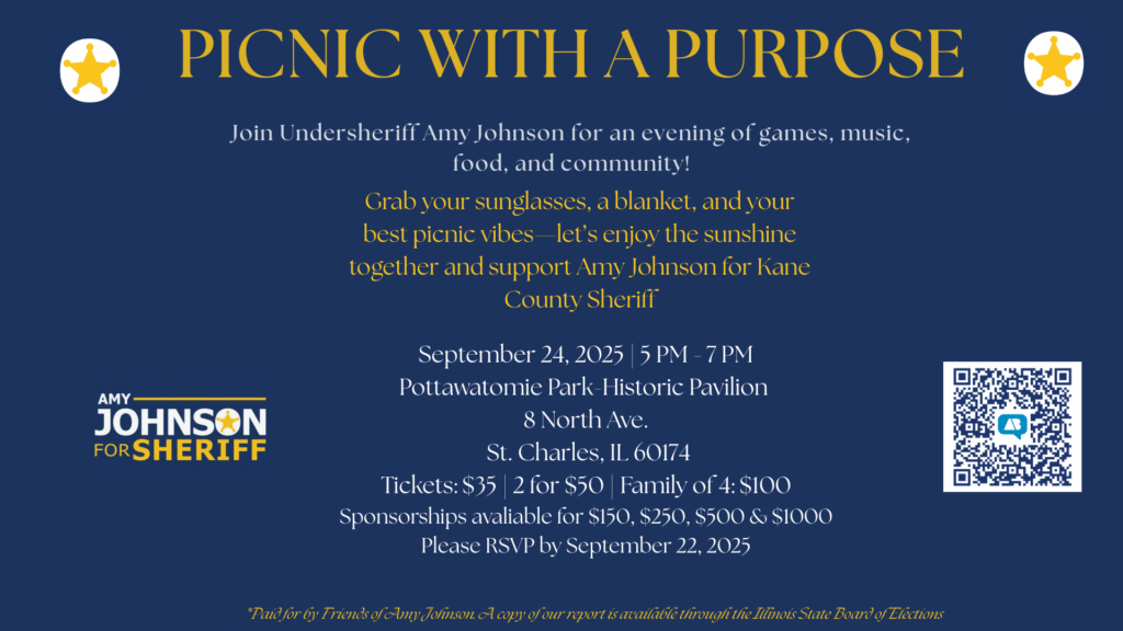 Join Undersheriff Amy Johnson for an evening of games, music, food, and community! Grab your sunglasses, a blanket, and your best picnic vibes-let’s enjoy the sunshine together and support Amy Johnson for Kane County Sheriff September 24, 2025 |5 PM – 7 PMPottawatomie Park-Historic Pavilion8 North Ave.St. Charles, IL 60174 Tickets: $35 | 2 for […]